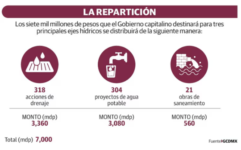 | Destinan 7 mil millones a 643 obras A través de la estrategia de Acupuntura Hídrica y la modernización de cuatro plantas de tratamiento, se recuperarán 800 litros por segundo adicionales equivalentes a más de 7 mil 300 pipas diarias mediante la reparación masiva de fugas y el saneamiento de aguas residuales. La Jefa de Gobierno, Clara Brugada Molina, destacó que este año su administración invertirá 19 mil millones de pesos para atender temas hídricos y de drenaje en la Ciudad de México, entre ellos, la reparación de fugas y la detección satelital de posibles socavones. En conferencia, la mandataria capitalina explicó que este año se llevarán a cabo 643 obras en agua, drenaje y saneamiento, mismas para las que su administración destinará siete mil millones de pesos. En 2026, estamos aumentando 77 por ciento, la inversión en obras. Así que cuando decimos que estamos construyendo, que estamos avanzando en la capital de la inversión y de la inversión pública, es porque estamos destinando de manera histórica, recursos a lo que más requiere la población, mencionó la funcionaria. | ||