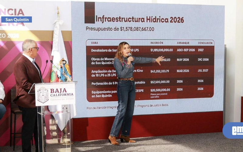SAN QUINTÍN.- Con una inversión superior a mil 578 millones de pesos, el Gobierno de Baja California anunció un paquete de obras para fortalecer el abastecimiento de agua potable e infraestructura social en el municipio de San Quintín. Durante la presentación del Plan Integral de Justicia Social de San Quintín, la gobernadora Marina del Pilar Ávila Olmeda destacó que la mayor inversión estará destinada a infraestructura hídrica, con el objetivo de atender el rezago histórico en el acceso al agua potable en la región. La mandataria estatal explicó que uno de los proyectos principales es la construcción de la desaladora de San Quintín, cuya obra iniciará en agosto de 2026 y se prevé concluir en 2027, con una inversión aproximada de 1,189 millones de pesos. A esta obra se suman los trabajos de macrodistribución del agua desalinizada, con una inversión estimada en más de 267 millones de pesos, que permitirá llevar el recurso a distintas comunidades del municipio. Dentro del paquete de obras también se contempla la ampliación de la desaladora Padre Kino, con una inversión de 43 millones de pesos, así como la perforación de cinco pozos de agua potable, con recursos por 57.5 millones de pesos. Asimismo, se destinarán 20.5 millones de pesos para el equipamiento de la gerencia de la Comisión Estatal de Servicios Públicos en San Quintín, con el objetivo de fortalecer la operación y mantenimiento de la red hidráulica. En materia de infraestructura social, el plan contempla 21 millones de pesos para la ampliación de un Centro de Atención Infantil, además de la incorporación de unidades de transporte público para niñas y niños de campos agrícolas, con el fin de facilitar su acceso a servicios educativos y de cuidado. También se anunció la donación de dos predios para proyectos educativos: uno en la colonia Lomas de San Ramón, donde se construirá un Centro de Educación y Cuidado Infantil, y otro en la colonia Internacional, donde el Gobierno Federal edificará un Telebachillerato. En cuanto a infraestructura urbana, se invertirán 53 millones de pesos en la construcción y rehabilitación de vialidades como Benito Juárez, Salvatierra, calle Cañada y el acceso al Centro Integrador del Bienestar en Camalú, inmueble que fue inaugurado este martes 10 de marzo como parte de las acciones para mejorar los servicios públicos en la región. La gobernadora señaló que estas obras buscan reducir las brechas de desarrollo en el municipio más joven del estado, fortaleciendo el acceso al agua, la educación y la movilidad para sus habitantes. | ||